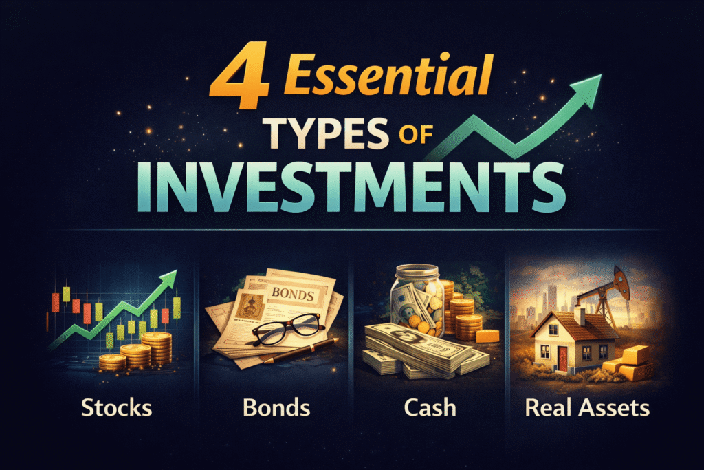 Many beginners lose money because they invest without understanding how different assets behave. Learning the 4 types of investments gives you a strong foundation for long-term success.